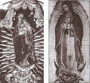 What does that have to do with Mexico, or the image on the tilma? The statue in Spain bears little resemblance to the image. An icon is a visual representation of prayer, speaking to and of the mystical through symbolism. The image of a woman clothed with the sun, with the moon under her feet is described in Revelation. The symbolism traditionally refers to The immaculate Conception, which is the name of the shrine in Spain where the statue of Our Lady of Guadalupe is.In addition, there is a second statue at that shrine (shown to the left) placed there by the Franciscans about a century before the miracle in Mexico. This statue bears a striking resemblance to the image.